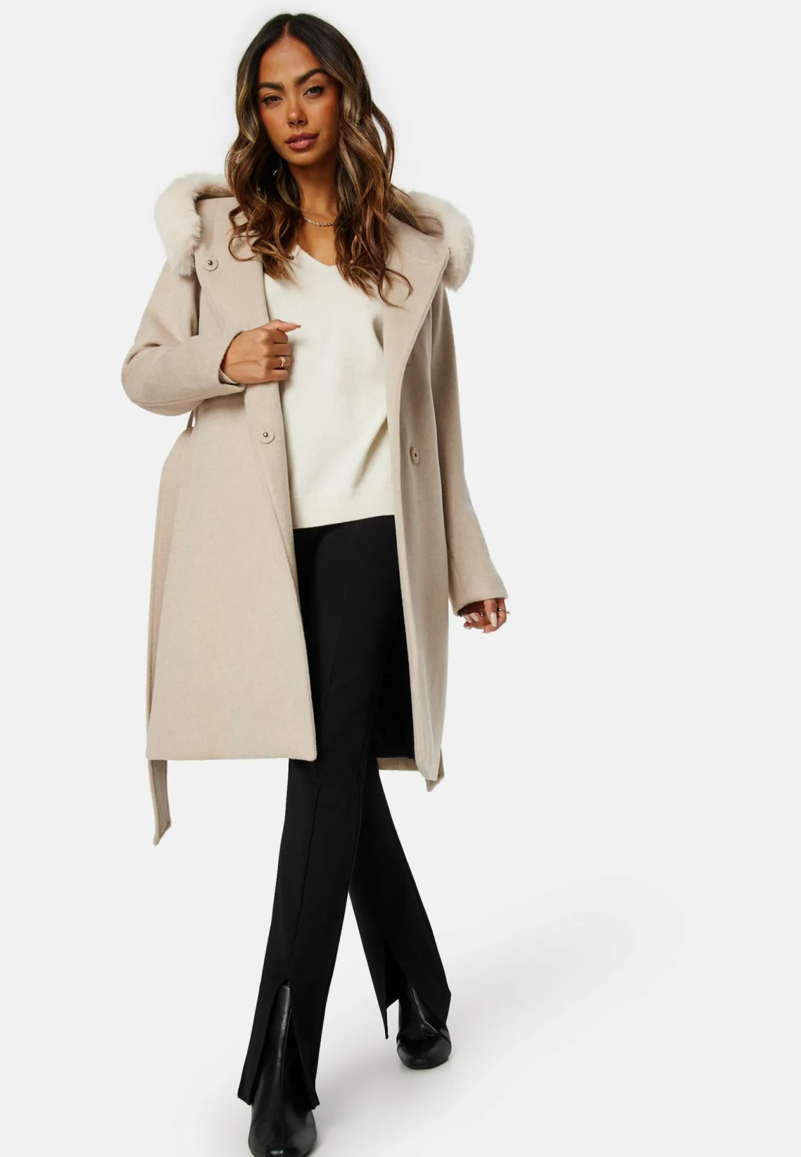 Elegantti takki ROCKANDBLUE-tuotemerkiltä solmunauhalla ja tekoturkiksella.