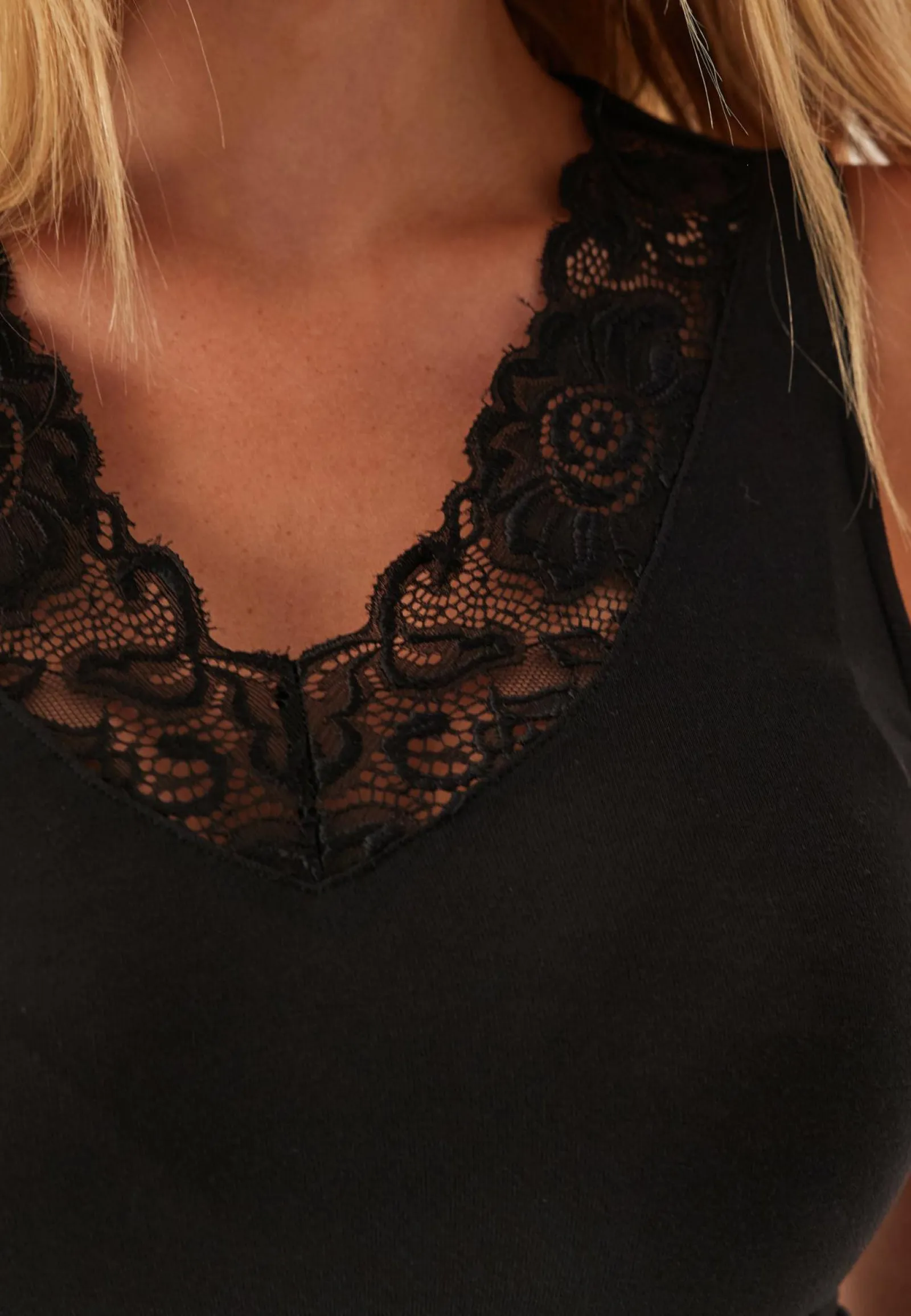 – V-kaula-aukkoinen kaula-aukko pitsireunuksella